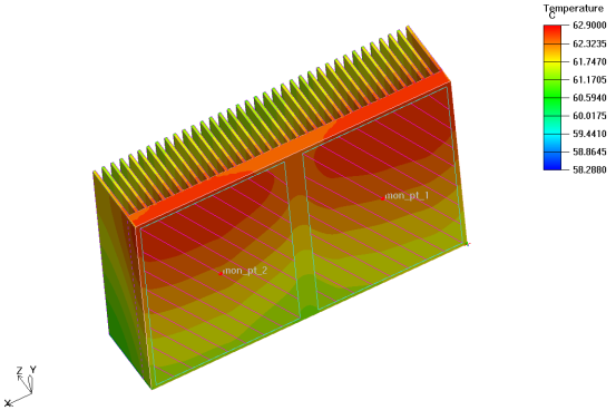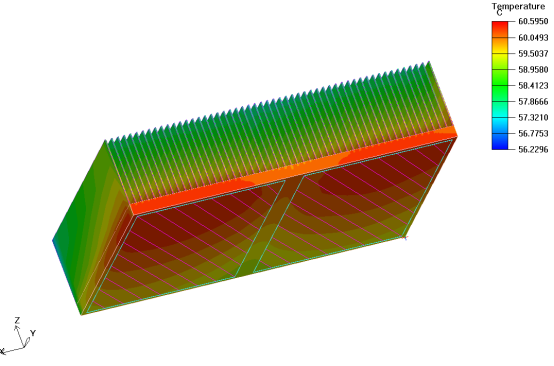 优化后散热器表面的最高温度降低了2.5摄氏度,整个散热器的重量有大幅度降低,很好的满足了产品的设计需要。